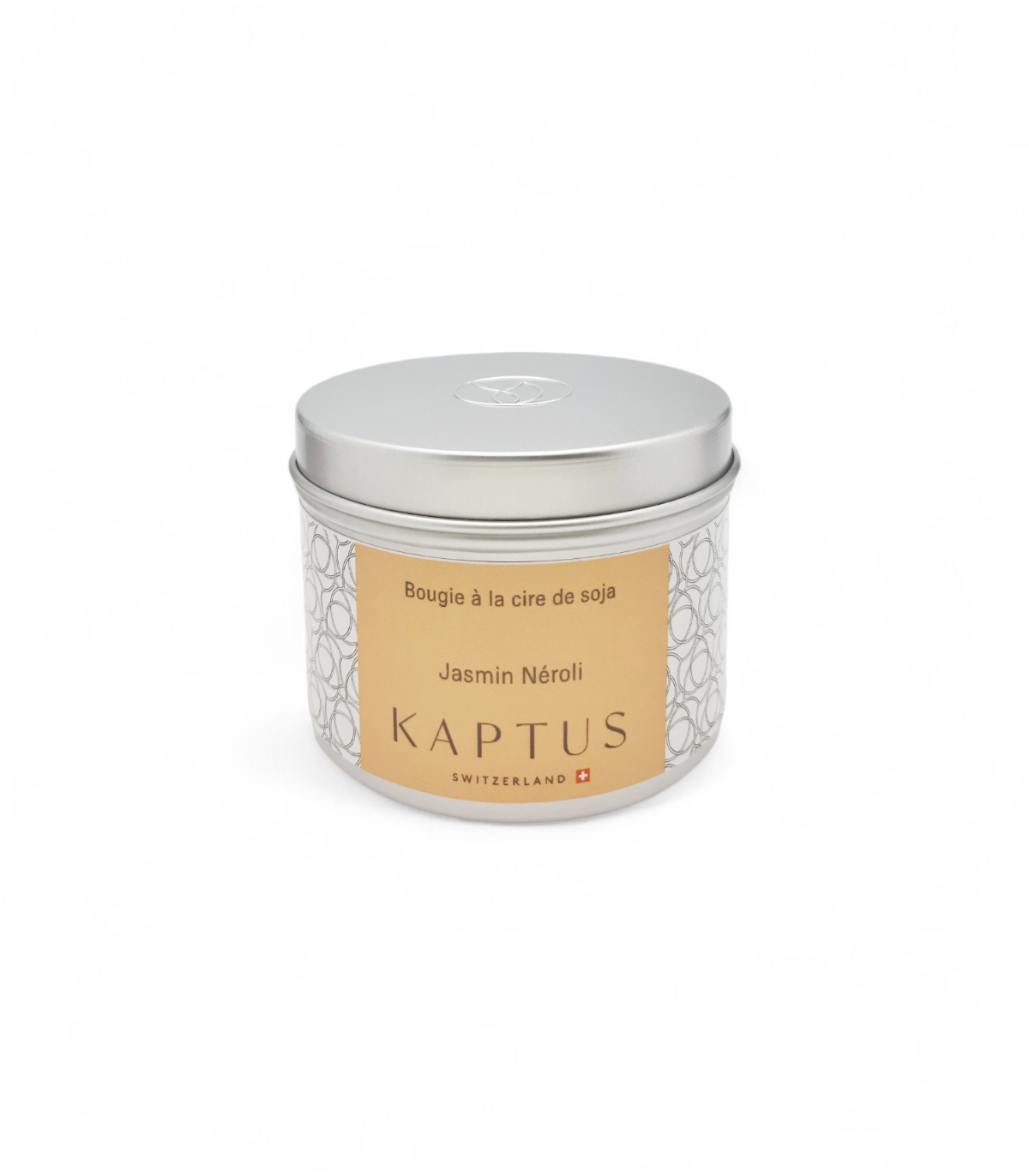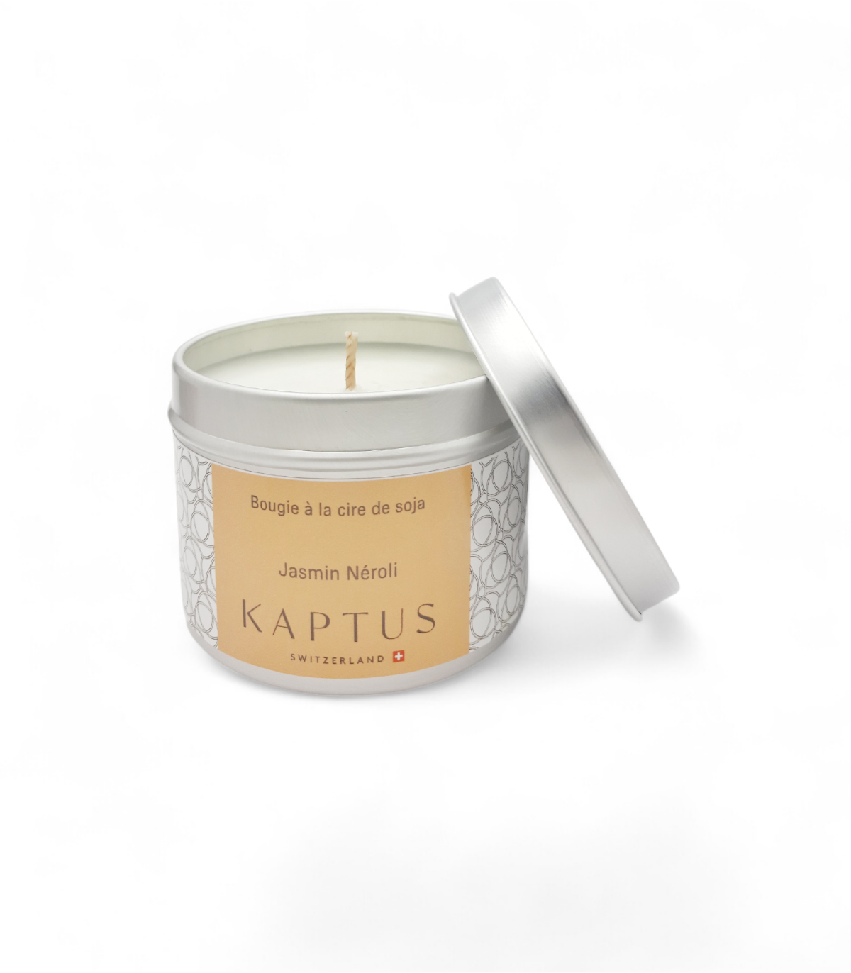 Jasmin Neroli Soja-Wachs-Kerze. Reisekollektion. Ein aromatischer Duft, der die blumige Note von Jasmin mit der Süße der Orangenblüte verbindet und Noten von Moschus, Rose, Veilchen und Vanille enthält.